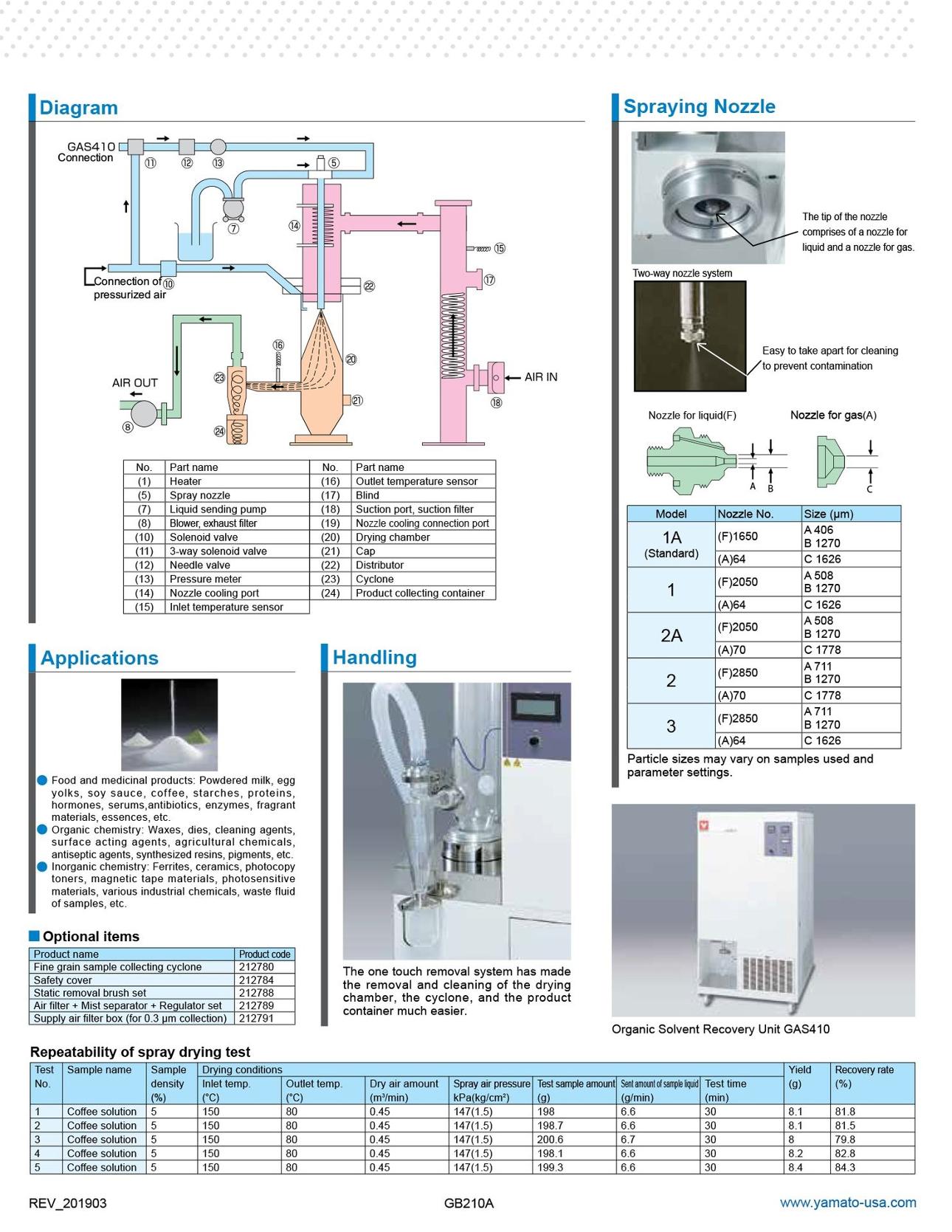 The Yamato GB210A mini spray dryer is a compact and versatile spray dryer that can easily produce powder on a laboratory scale. The GB-210A spray dryer unit is capable of drying ultra small samples as low as 30ml of sample and can spray dry it into fine powder 1μm to 25μm in size. Moreover, our versatile GB210A compact spray dryer can perform a variety of applications from preliminary experiments in a pilot plant to drying work in general laboratories.