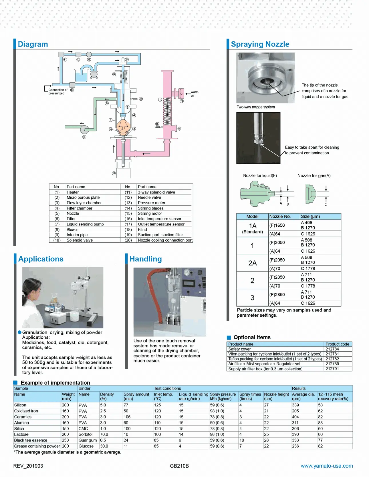 The Yamato GB210B spray drying granulator incorporates outstanding fluid bed drying technology made for sophisticated granulation of powder and drying of wet powder. Our GB210B Versatile Granulation Spray Dryer is a combination of the basic unit GB210 and the GF200 pulvis mini-bed attachment. In addition, this versatile granulating unit can be used for spray drying by installing the mini spray attachment GF300.