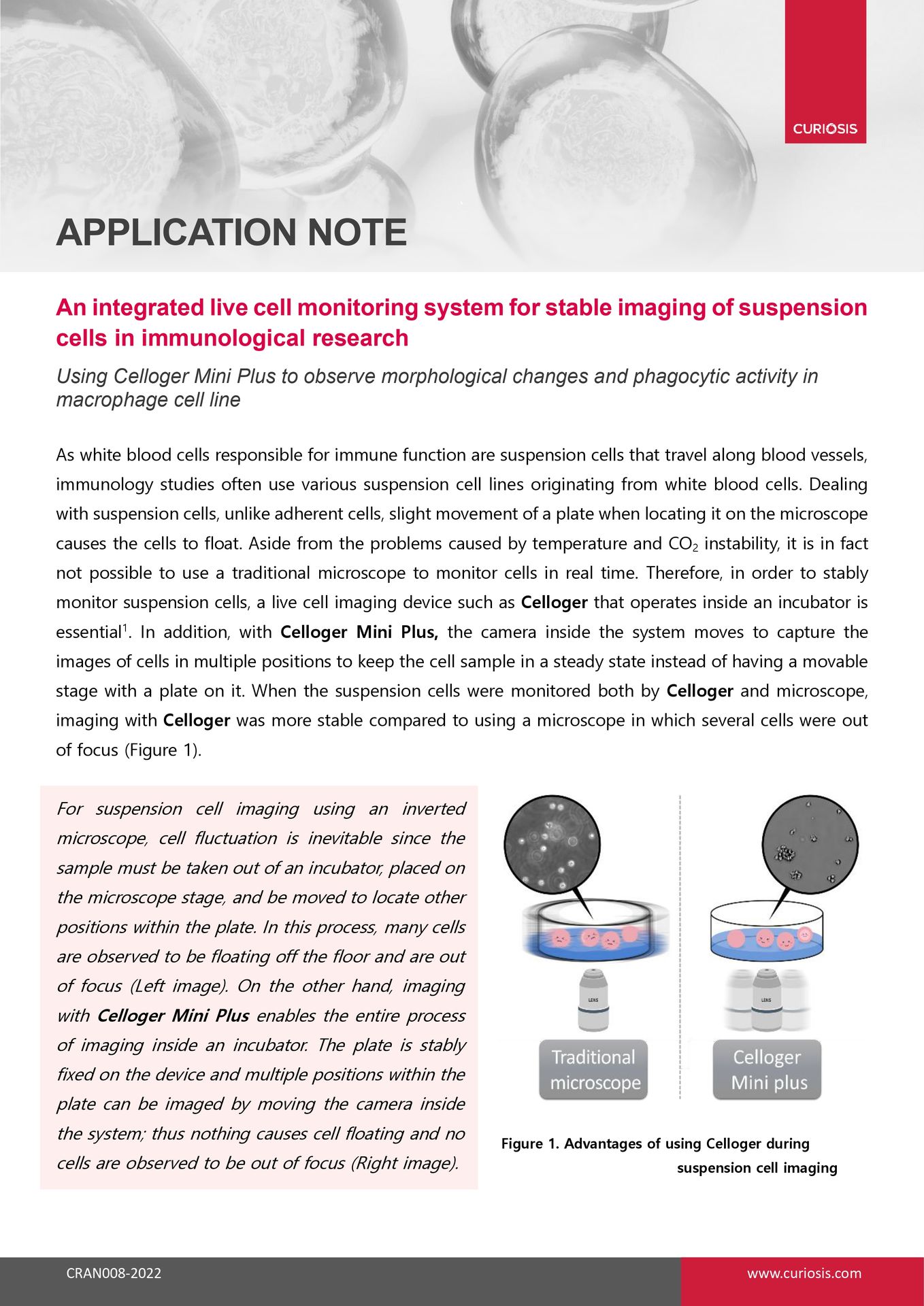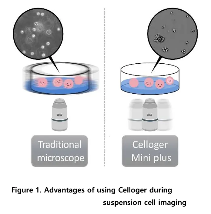 Suspension cells tend to float with even slight plate movement, making them go out of focus during imaging. Traditional microscopes require removing the plate from the incubator, causing temperature and CO₂ instability and physical disturbance. This makes stable, real-time monitoring of suspension cells challenging.