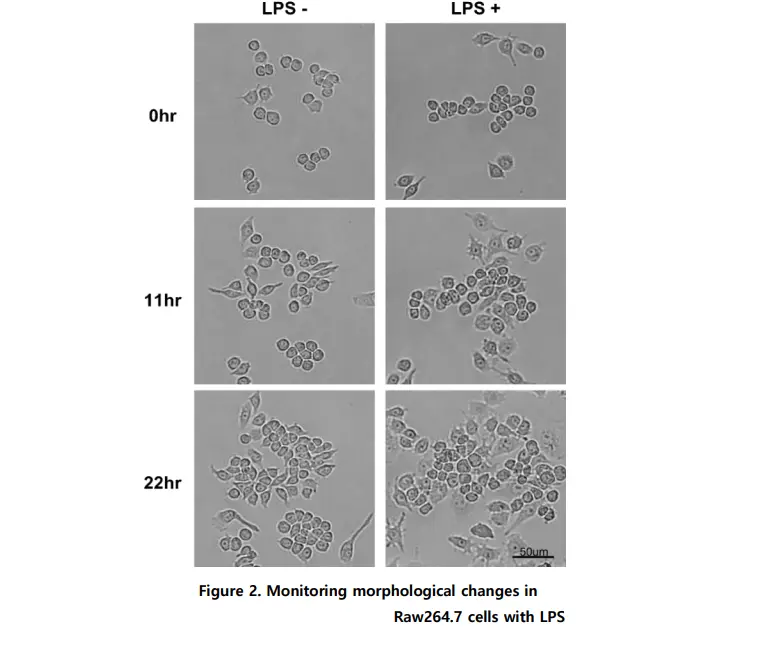 When Raw264.7 cells were stimulated by LPS, the differentiated cells increased. As round and thick cuboidal cells in a loosely adhered state were differentiated, they slowly spread and adhered more firmly in a spindle form, and this was observed through images taken every 15 minutes by Celloger Mini Plus (10X optics).