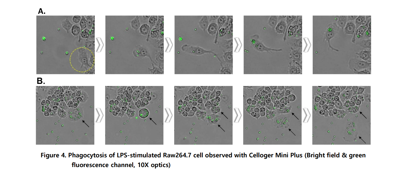 Yes, Celloger enables real-time visualization of phagocytosis using fluorescent latex beads. In this study, activated Raw264.7 cells engulfed 2 µm fluorescent beads, and the entire uptake process was recorded at 15-minute intervals. This approach allows continuous monitoring instead of relying only on endpoint assays.