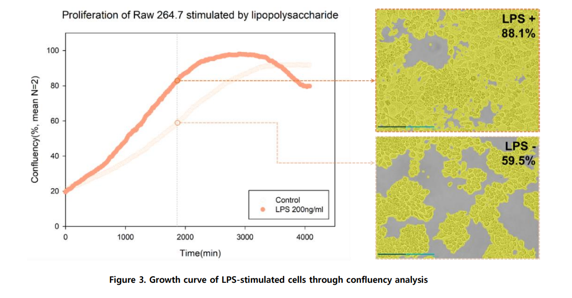 Cell proliferation is quantified using the confluency analysis function within the Celloger Mini Plus analysis app. Time-lapse images are analyzed to generate a cell growth curve. This provides quantitative data on proliferation following treatments such as LPS stimulation.