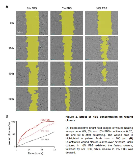 In representative images (Figure 3A), the 10% FBS control condition showed robust wound closure. In