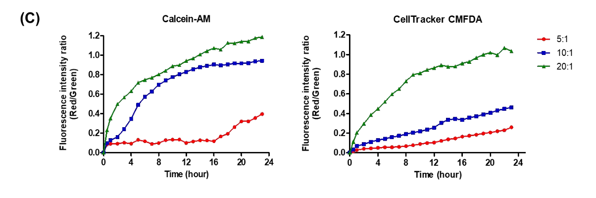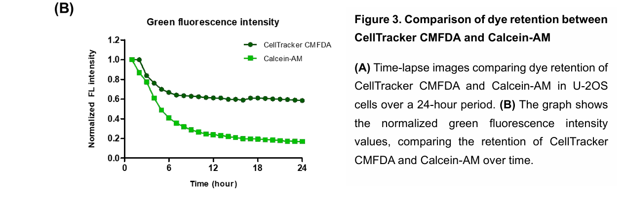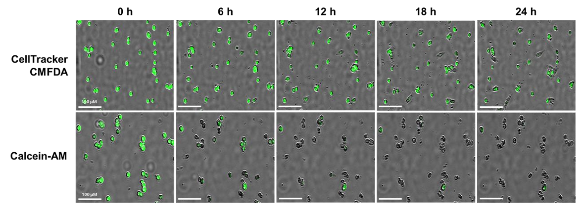 CellTracker CMFDA provides superior intracellular retention compared to Calcein-AM, with green fluorescence persisting for over 12 hours. This improved stability reduces artificial elevation of cytotoxicity measurements caused by dye leakage. As a result, it enables more accurate and reliable long-term monitoring of NK cell activity.