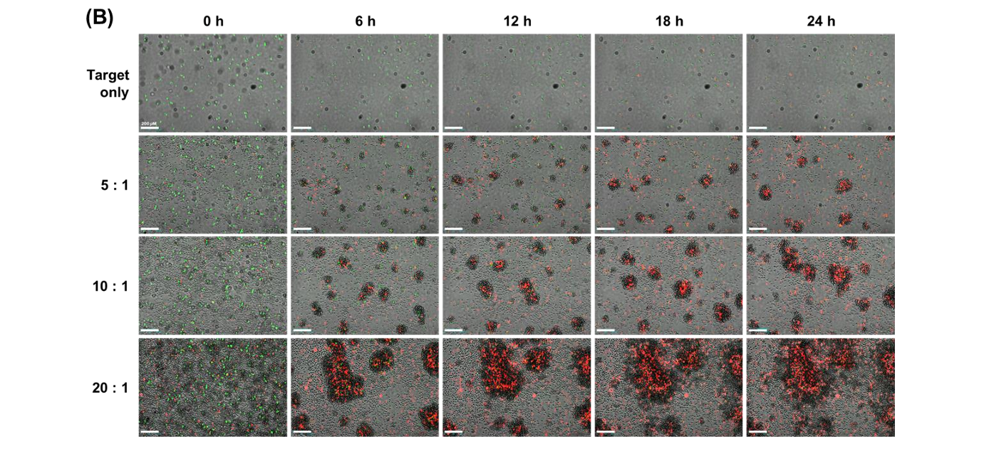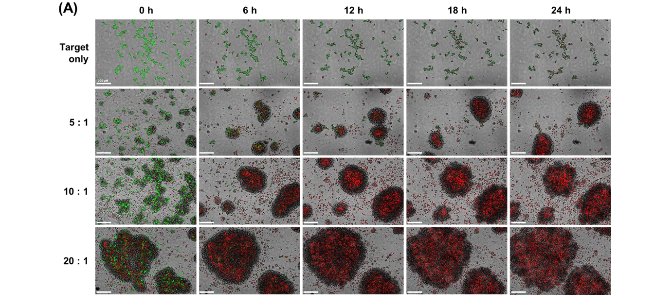 The study evaluated E:T ratios of 5:1, 10:1, and 20:1 using NK-92 cells as effectors and U-2OS cells as targets. Higher E:T ratios resulted in increased red fluorescence intensity, decreased green fluorescence, and larger cell clusters. These findings confirmed that cytotoxicity increased proportionally with effector cell concentration.