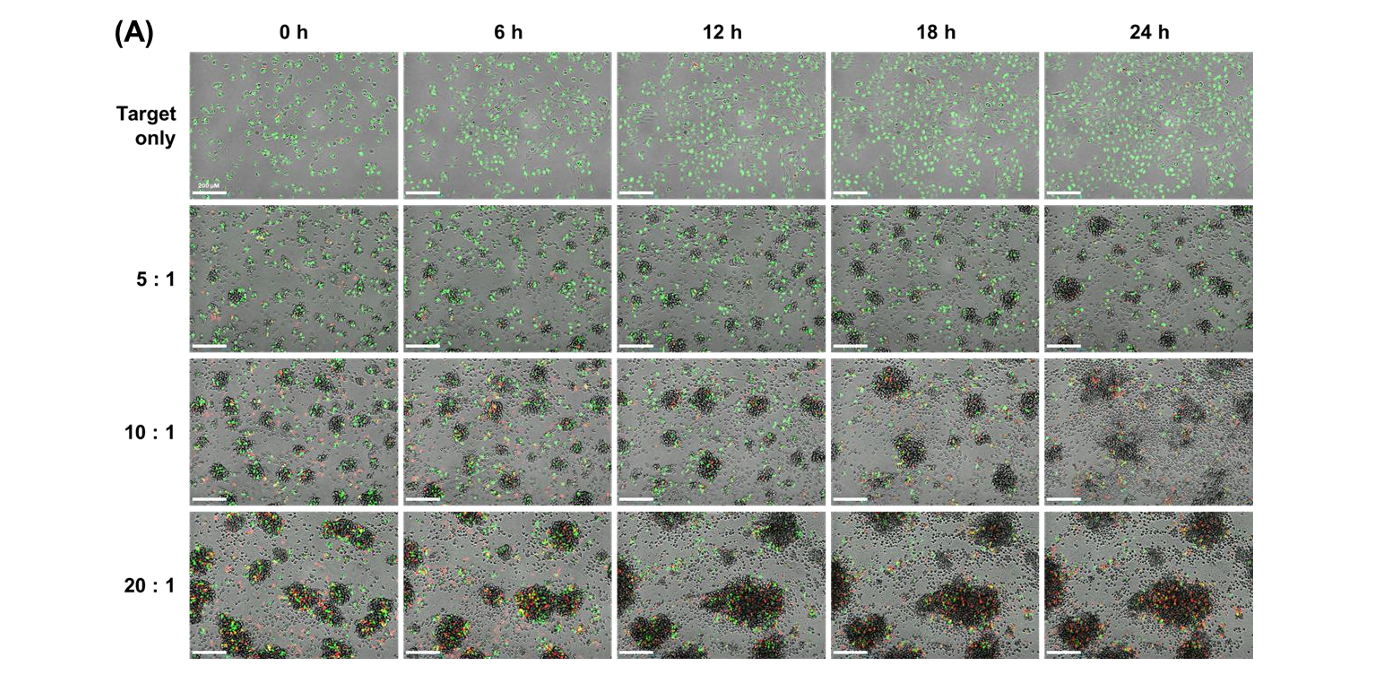 NK cell-mediated cytotoxicity was monitored over a 24-hour period. Images were captured at 1-hour intervals using the Celloger® Pro with a 4X objective lens. This continuous imaging enabled detailed time-lapse analysis of cell death progression.