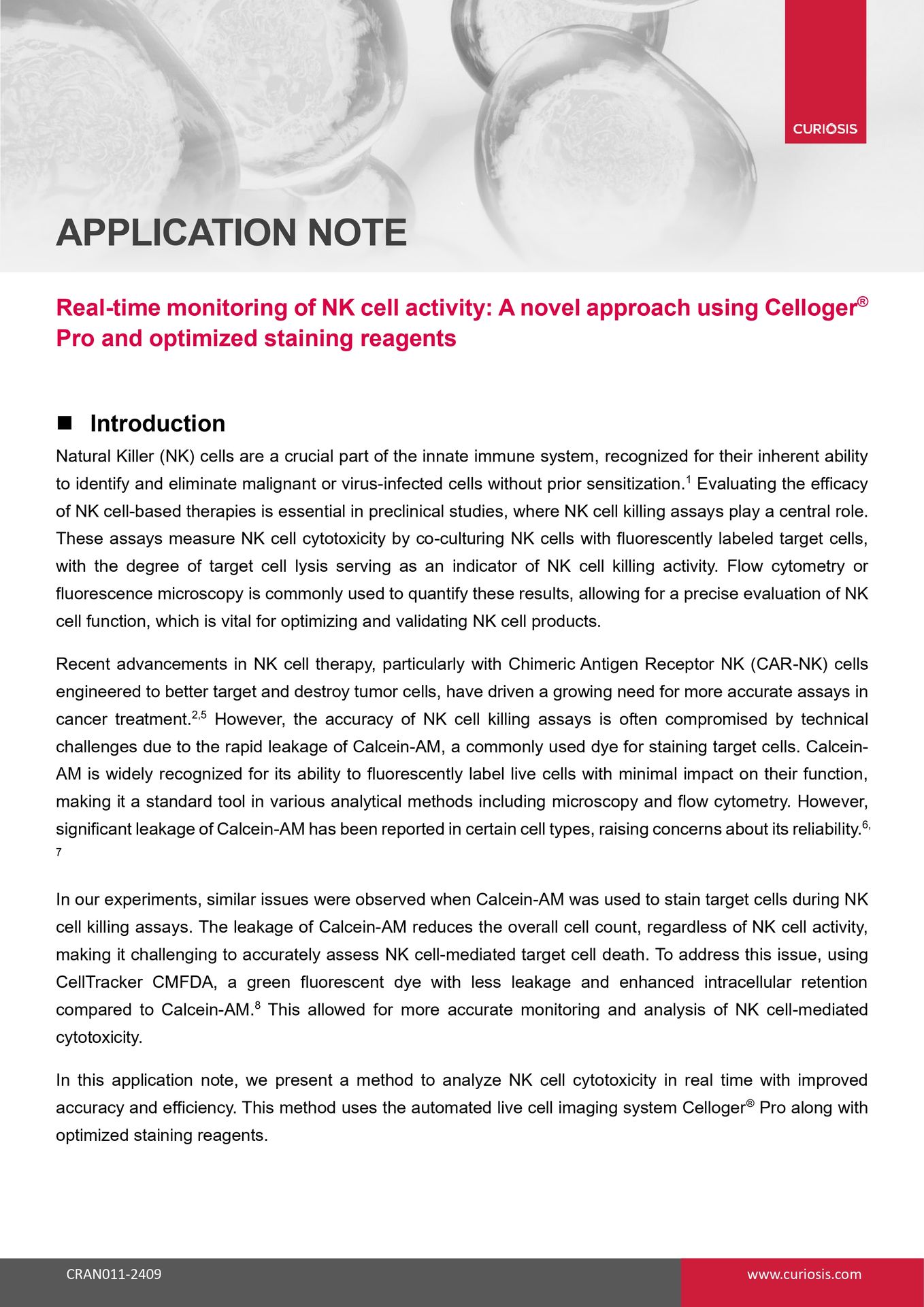 to access the complete live-cell imaging workflow, optimized fluorescent staining protocol, comparative dye stability analysis, and quantitative real-time cytotoxicity data demonstrating accurate NK-92–mediated killing of U-2OS cells using the Celloger® Pro system.