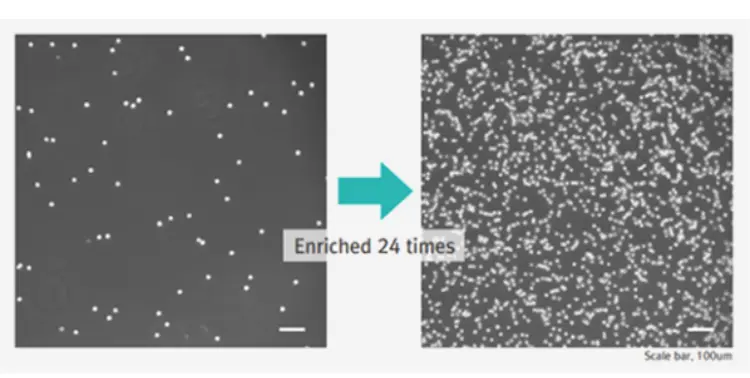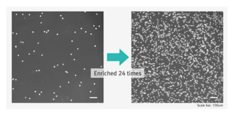 Cellpuri® efficiently separated HL-60 cells from medium without spinning-down the cells and more than 20-fold enrichment (121.2x10 cells/mL) was observed in HL-60 cells at an initial concentration of 4.9 x 10 cells/mL.