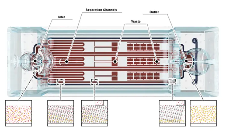 It is a microfluidic chip-based cell separation and concentration technology developed by Curiosis. Countless micrometer-sized channels inside the chip create a rheological flow that separates, concentrates, and removes particles of a specific size from the solution. Microchannels were strategically designed to isolate cells according to their size where larger cells are directed towards one side whereas smaller cells flow randomly on lateral axis that eventually compile on the other side. FLF technology can be applied to cell enrichment, white blood cell separation, and blood-plasma separation.