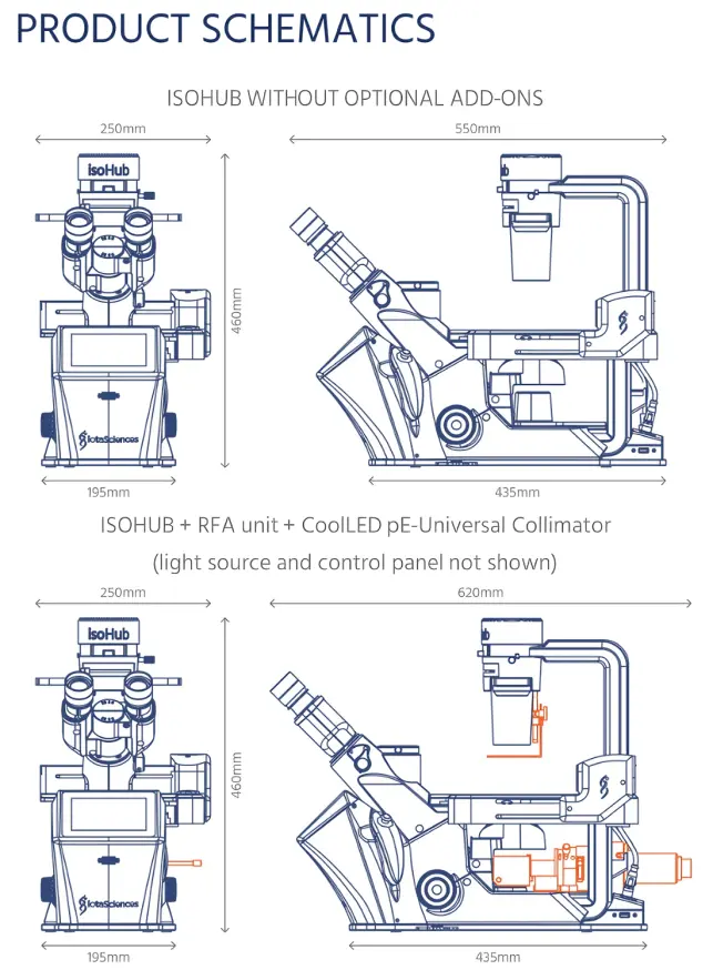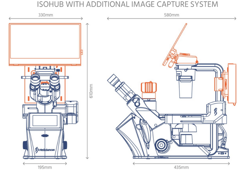 An automated microscope that can be combined with an isoCell or isoPick as part of either the Cloning Platform or scPicking Platform, respectively. Inclusion of the isoHub enhances workflows for both platforms, enabling quick and easy single-cell chamber selection when scanning through GRIDS, and seamless data transfer between devices.