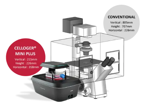 Celloger® Mini Plus features a compact footprint of 226 (H) × 358 (L) × 215 (W) mm, allowing multiple units to fit inside a standard CO₂ incubator.
