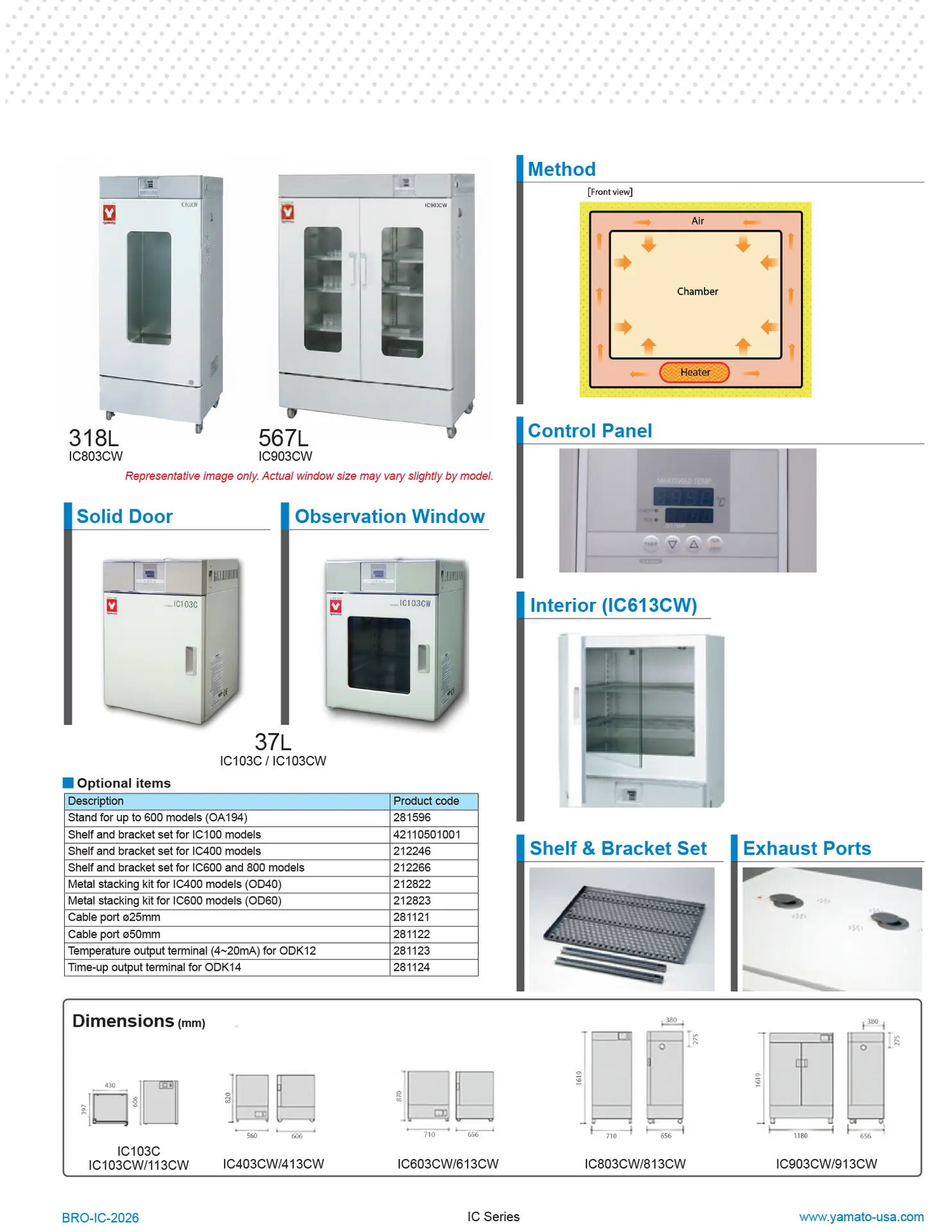 Stand, Stacking kit, Additional shelf, Cable hole (25/50mm or 30/50mm), Temp. output terminal, Time-up output terminal for alarm device |