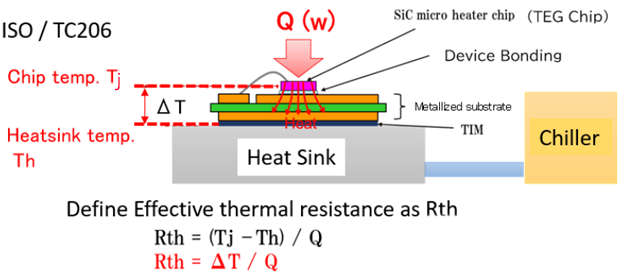 Thermal resistance (Rth) = Temperature difference (ΔT) between TEG chip and heat sink / divided by electric power (Q)